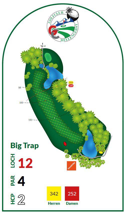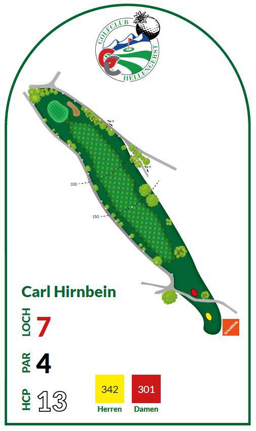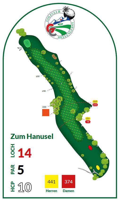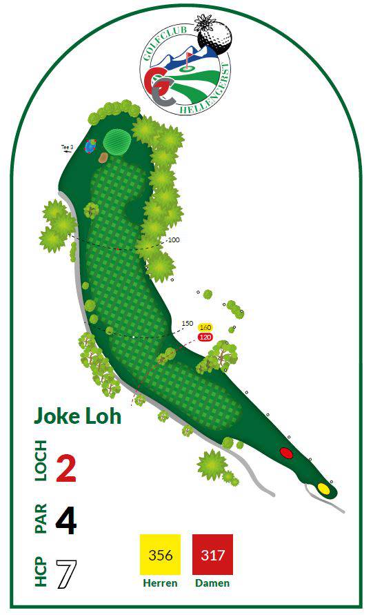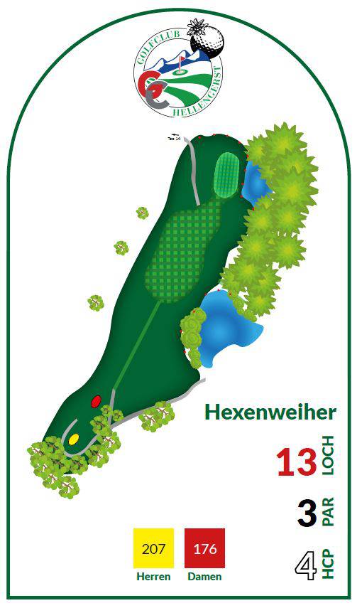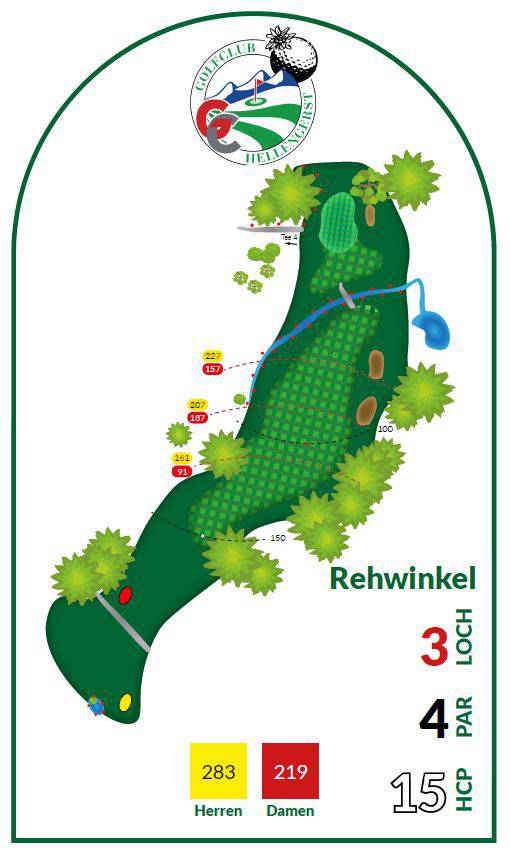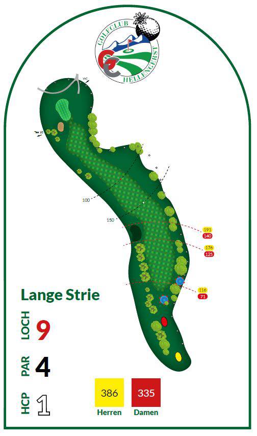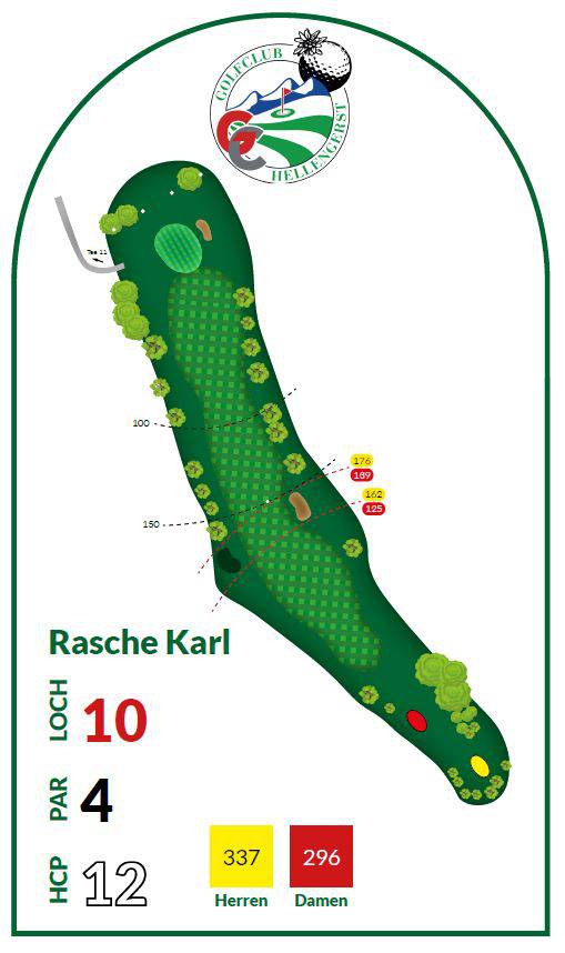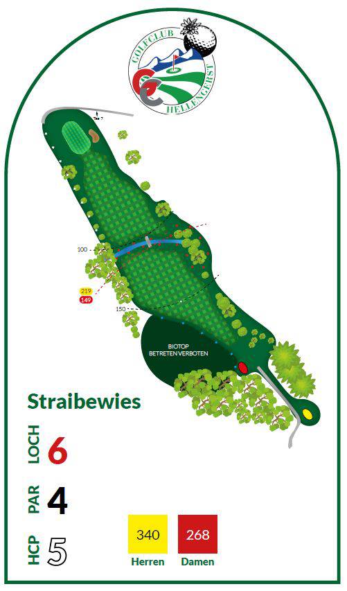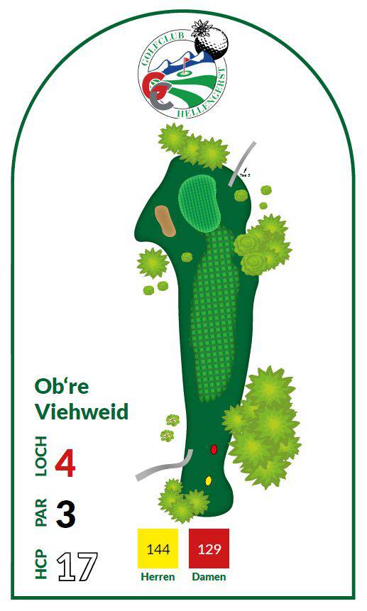 Erneut ist Köpfchen gefragt. Der Abschlag sollte etwa 150 Meter weit über den Richtungspfosten knapp rechts vom auffälligen „Eckbaum“ geschlagen werden. Auf den Slice warten freundliche Fangbunker. Der kurze Schlag ins Grün wird dann durch den kleinen Graben nicht mehr wesentlich beeinträchtigt.