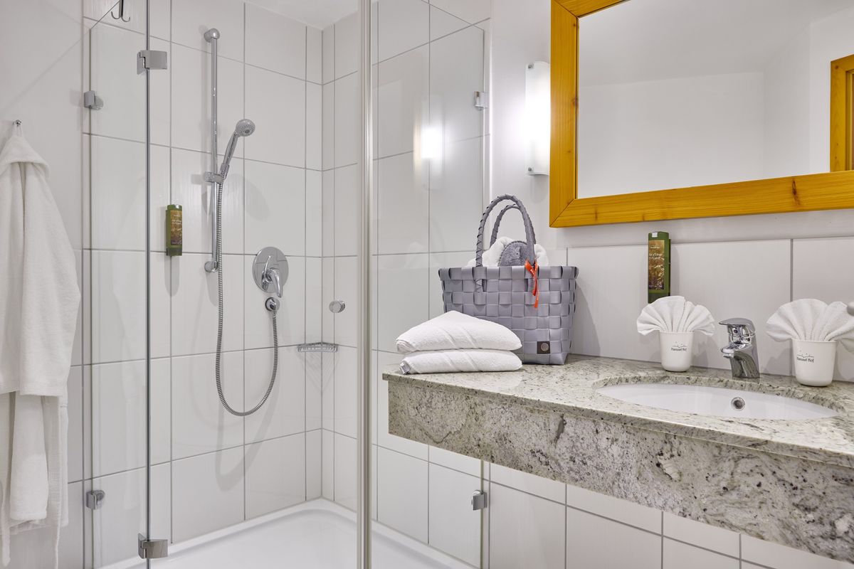 - bathroom with shower and toilet, hairdryer, vanity mirror