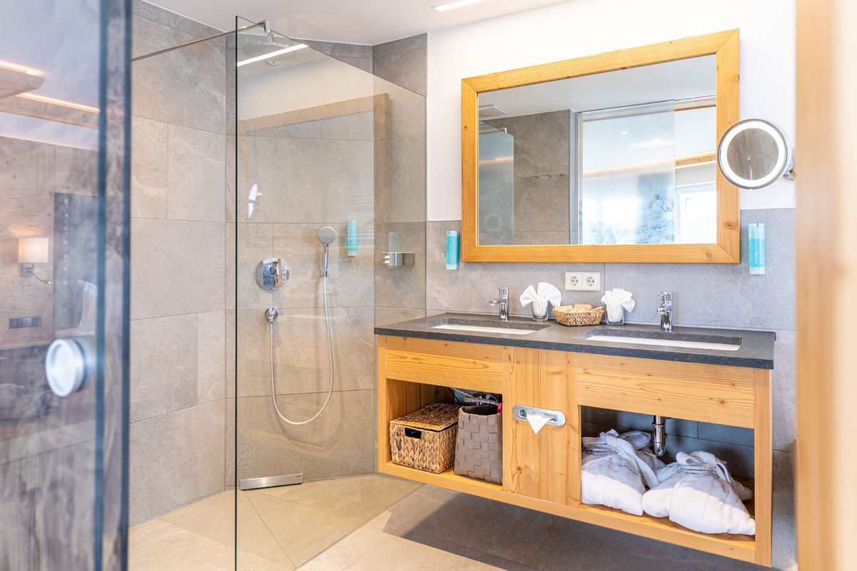 - Bathroom with shower, separate toilet, hairdryer, vanity mirror