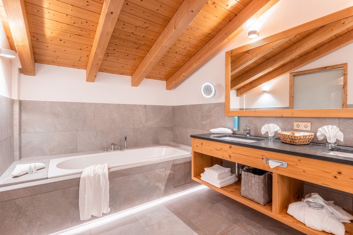 - bathroom with rain shower and bathtub, double washbasin, separate toilet, hairdryer, illuminated make-up mirror